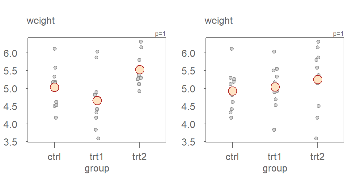 plant_shuffle <- eda_shuffle(PlantGrowth, weight, group)The jitter plots below show the original dataset (left), and the shuffled dataset (right).